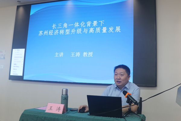 此次培訓(xùn)邀請(qǐng)了蘇州市委黨校王濤教授作《長(zhǎng)三角一體化背景下蘇州經(jīng)濟(jì)轉(zhuǎn)型升級(jí)與高質(zhì)量發(fā)展》專題報(bào)告。王教授圍繞長(zhǎng)三角一體化本質(zhì)、蘇州經(jīng)濟(jì)高質(zhì)量發(fā)展的歷程、經(jīng)濟(jì)高質(zhì)量發(fā)展的基本邏輯和存在問(wèn)題等方面進(jìn)行了深入而精彩的闡述,為學(xué)員們進(jìn)一步開(kāi)展好工作開(kāi)闊了思路,提供了扎實(shí)的理論積淀。