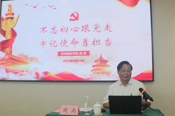 隨后,蘇州城市學(xué)院黨委委員、副校長(zhǎng)周高作了《不忘初心跟黨走 牢記使命勇?lián)?dāng)》專題黨課報(bào)告。周校長(zhǎng)引經(jīng)據(jù)典,通過(guò)舉例介紹歷史人物以及歷史故事的方式,從黨的宗旨、民族精神、人文情懷和科學(xué)理性四方面闡述了什么是初心使命,并對(duì)如何踐行初心、擔(dān)當(dāng)使命作了詳細(xì)講解。