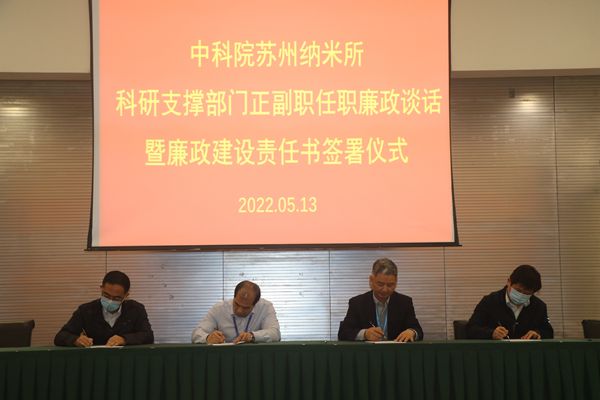 5月13日上午,蘇州納米所舉行新任科研支撐部門正副職任職廉政談話暨廉政建設(shè)責(zé)任書簽署儀式,會議由紀(jì)委書記王啟飛主持,研究所黨政班子成員、新任科研支撐部門正副職及職能部門負(fù)責(zé)人參加會議。?