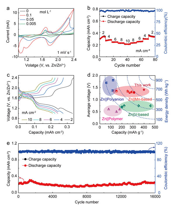 為了解決這一問題,中科院蘇州納米所邸江濤、李清文團(tuán)隊(duì)在經(jīng)典的MnO2/MnOOH轉(zhuǎn)換反應(yīng)的基礎(chǔ)上引入二氧化錳的沉積溶解反應(yīng),可以將電極活性物質(zhì)因歧化反應(yīng)溶出的錳離子再沉積到電極上,實(shí)現(xiàn)了高循環(huán)穩(wěn)定性和高能量密度的鋅錳電池。