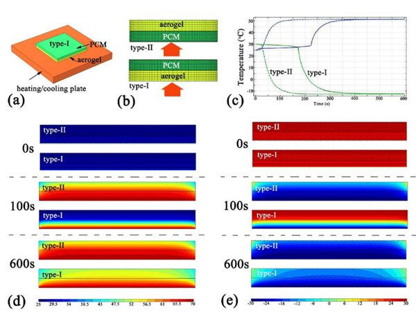 目前有很多研究選擇將相變材料封裝在氣凝膠中,解決相變材料的泄漏和低負(fù)載率問題,然而這種相互兼并的策略使得氣凝膠失去其獨(dú)特的結(jié)構(gòu)和低熱導(dǎo)率。因此本工作設(shè)計(jì)了如圖2a所示的兩種LBL結(jié)構(gòu),將具有低熱導(dǎo)率的氧化硅氣凝膠與具有高相變焓的相變微膠囊結(jié)合,得到一種在極寒(-30℃)和炎熱(70℃)條件下的熱管理結(jié)構(gòu)。如圖2所示,采用氣凝膠作為保溫層時(shí),溫度在94 s時(shí)開始低于20 ℃。Ⅰ型和Ⅱ型LBL的溫度開始降到20℃以下的時(shí)間分別為450s和252s。與氣凝膠層相比,Ⅰ型LBL結(jié)構(gòu)延遲了4.8倍,且達(dá)到熱平衡時(shí),LBL的溫度比氣凝膠的溫度高達(dá)10℃以上,而最高溫差達(dá)到25℃以上。