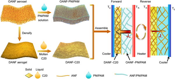 針對上述難題,中國科學院蘇州納米技術與納米仿生研究所氣凝膠團隊,提出了氣凝膠薄膜限域相變流體構筑柔性熱二極管策略(圖1)。首先制備芳綸(即Kevlar)納米纖維氣凝膠薄膜(OANF),為了進一步提升其力學強度和柔性,致密化處理得到DANF;其次,篩選出相變溫度接近、熱導率隨溫度變化趨勢相反、表面潤濕性能相反的兩種相變流體聚(N-異丙基丙烯酰胺)(PNIPAM)溶液和二十烷(C20);隨后利用氣凝膠薄膜強毛細作用力、高孔隙率等特性分別負載這兩種相變流體,制備出兩種氣凝膠限域相變流體OANF-PNIPAM和DANF-C20膜;最后,優(yōu)化這兩種氣凝膠限域相變流體厚度并通過彼此接觸構筑出熱二極管。此熱二極管具有良好柔性(曲率半徑為420μm)和力學強度(抗拉強度≥7.2MPa),同時,展現(xiàn)出優(yōu)異的熱整流性能,熱整流比可達2.0。此工作首次實現(xiàn)了柔性熱二極管制備,將加速熱二極管從理論研究到實際應用的進程。