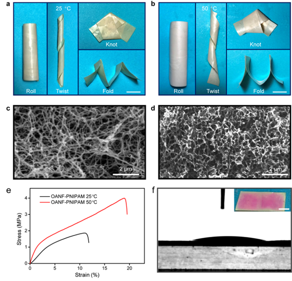 熱導率隨溫度升高而升高(正溫度系數(shù))材料種類稀少,PNIPAM水溶液作為一種臨界溶液溫度(LCST,32°C)型相變流體可在溫度升高時通過凝膠縮聚提升熱導率,因此本研究利用OANF限域PNIPAM水溶液獲得正溫度系數(shù)氣凝膠限域相變流體OANF-PNIPAM。得益于OANF自身柔韌性以及PNIPAM流體特性,OANF-PNIPAM薄膜在環(huán)境溫度低于或高于LCST時始終保持良好柔韌性,可反復卷曲、扭轉、打結,甚至折疊(圖2a-b)。從OANF、OANF-PNIPAM的掃描電鏡照片可分析出,當溫度超過LCST,PNIPAM分子由于發(fā)生相分離而包覆于芳綸納米纖維上,提高了OANF-PNIPAM薄膜的機械性能(圖2c-e)。此外,OANF-PNIPAM薄膜表現(xiàn)出親水特性(圖2f)。