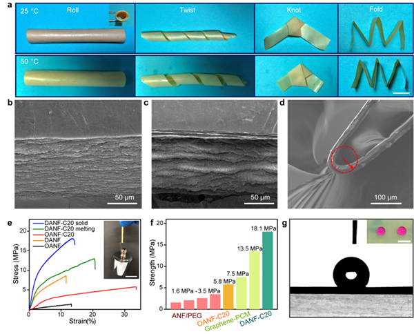 為了與OANF-PNIPAM相互匹配構建“Junction”結構, 篩選出與PNIPAM相變溫度接近、親疏水性相反、熱導率隨溫度變化趨勢相反(即負溫度系數(shù)) 的C20作為相變流體,為了進一步提升薄膜柔韌性,選擇DANF限域C20,最終獲得C20熔融前后均具有良好柔韌性的DANF-C20薄膜(圖3a)。DANF氣凝膠薄膜與DANF-C20薄膜的微觀形貌揭示了其具有優(yōu)異柔韌性能的原因,即致密化消除了大孔(>50nm),初始3D多孔網(wǎng)絡被壓縮成分層結構,每一層均由芳綸納米纖維密集編織而成(圖3b-d),使得DANF-C20抗拉強度較OANF-C20提高了3倍,也高于其他氣凝膠相變材料。C20的疏水性也賦予了DANF-C20 膜(圖3g),使其與親水的OANF-PNIPAM可直接接觸形成穩(wěn)定界面,避免因相互滲透,影響器件穩(wěn)定性。