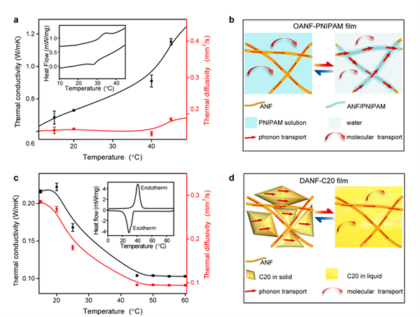 熱導率隨溫度變化是熱二極管整流性能關鍵參數(shù)。圖4a顯示了OANF-PNIPAM薄膜熱導率、熱擴散速率隨溫度變化趨勢,15°C(低于相變溫度)時,熱導率為0.66 W/m·K,45°C(高于相變溫度)時,增加到1.11W/m·K。當溫度低于相變溫度,OANF-PNIPAM導熱歸因于氣凝膠骨架中聲子輸運和PNIPAM溶液中分子相互作用,當溫度高于相變溫度時,PNIPAM包覆于氣凝膠骨架上,聲子傳輸增強,因聲子比分子傳熱更有效,故OANF-PNIPAM熱導率提高(圖4b)。DANF-C20薄膜熱導率、熱擴散速率隨溫度變化如圖4c所示。當溫度低于C20相變溫度時(C20處于結晶態(tài)),DANF-C20熱導率約為0.22W/m ·K,而當溫度高于C20相變溫度時(C20處于熔融態(tài)),DANF-C20的熱導率降低至0.10W/m·K,這是因為C20處于結晶態(tài)時,DANF-C20導熱全部歸因于聲子傳輸,而當C20處于熔融態(tài)時,導熱由聲子傳輸變?yōu)榈托У姆肿酉嗷プ饔茫?/font>DANF-C20熱導率降低(圖4d)。