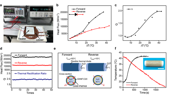根據(jù)理論推導,相變熱二極管在最優(yōu)情況下熱整流比與熱導率相變前后比值相關,計算出熱整流比約為2.0。同時,實驗室搭建了熱整流性能測試裝置,如圖5a所示,冷端和熱端分別由循環(huán)水冷裝置和Bi2Te3熱電陶瓷片精確控制溫度。正向熱流和反向熱流均隨兩端溫差增加而增加,但正向熱流增加幅度更高,當兩端溫差增加到40°C時,熱整流比達到最大值2.0(圖5b-c)。熱二極管的可靠性在實際應用中至關重要,為了表征可靠性,測試了此熱二極管熱整流循環(huán)穩(wěn)定性,循環(huán)50次,熱整流比在1.94和2.03之間波動,穩(wěn)定性良好(圖5d),這要歸功于OANF及DANF氣凝膠薄膜優(yōu)異的納米限域功能、OANF-PNIPAM及DANF-C20薄膜間親水-疏水界面穩(wěn)定性等。進一步,通過構建簡單模型證實此柔性熱二極管在實際熱管理應用中可行性(圖5e-f)。此工作關于柔性熱二極管構筑策略將極大地推動熱二極管的技術進步。