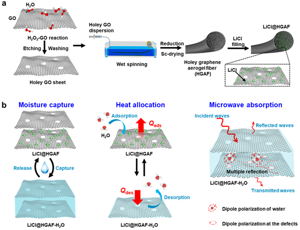 為了提升纖維的吸濕動力學,將氧化石墨烯進一步進行氧化造孔得到打孔氧化石墨烯HGO,之后通過濕法紡絲、氫碘酸還原和超臨界干燥,制備出了打孔石墨烯氣凝膠纖維(HGAFs)(圖1)。隨后,以HGAFs為多孔骨架,使用浸漬的方法將LiCl負載到纖維多孔骨架中。