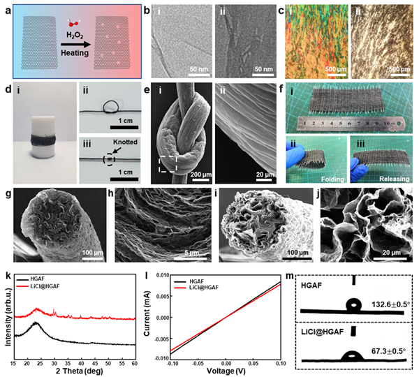 通過過氧化氫在高溫下對氧化石墨烯進行刻蝕處理,氧化石墨烯片層上形成了納米孔(圖2a-c),經過刻蝕之后的打孔氧化石墨烯分散液可以形成與氧化石墨分散液類似的液晶相,這有助于在紡絲過程打孔石墨烯片層發(fā)生動態(tài)自組裝。所得的打孔石墨烯氣凝膠纖維具有優(yōu)異的柔韌性(彎曲剛度Rf=3.08×10-9 N m2),可以進行彎曲、纏繞、打結和編織(圖2d-f)。由HGAFs與LiCl@HGAFs的掃描電鏡圖可知,LiCl均勻分散在打孔石墨烯片層上,并且纖維本身依然保留了多孔結構。LiCl引入使得LiCl@HGAFs纖維變得更加親水(接觸角從132.6°下降到了67.3°,圖2m),同時并未對纖維本身的導電性能產生明顯的影響(圖2l)。