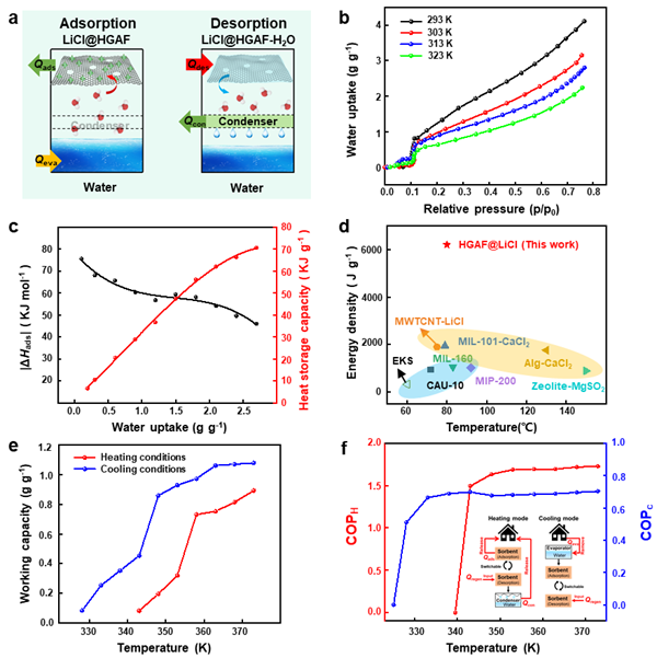 圖4. LiCl@HGAFs吸附式制熱/制冷原理與性能