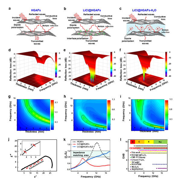 水在微波頻率下具有色散和高損耗的特性,是設計寬頻吸收器的理想材料。因此吸濕后LiCl@HGAFs具有更好微波吸收性能。如圖5所示,在吸濕之后,材料在2.5 mm厚度下有效吸收頻寬在8.31GHz-18GHz,在頻率為17.3 GHz時達到最低的反射損耗RL= -27.9 dB。在未吸濕時,在中高頻段沒有表現出明顯的吸收性能(反射損耗RL>-10 dB)。LiCl@HGAFs的微波吸收機制主要包括電導損耗、界面極化損耗和偶極子的極化損耗,而微波吸收性能的提高歸功于材料吸濕引入的水提供了更多的極化損耗(圖5c),同時,水的引入調節(jié)了材料的阻抗,實現了更好的阻抗效果,減少了微波反射,進一步提升了材料的微波吸收能力。
