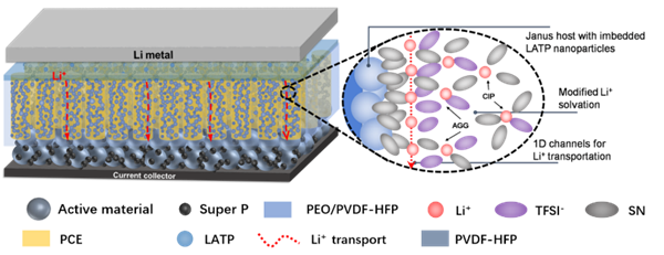 如圖1所示,JSE中Janus基底由兩種結(jié)構(gòu)復(fù)合而成,分別為用于保護(hù)鋰負(fù)極的PVDF-HFP/PEO致密層,和用于提高電解質(zhì)離子電導(dǎo)率的PVDF-HFP/ LATP通道結(jié)構(gòu)層。將Janus基底與丁二腈(SN)基固態(tài)電解質(zhì)復(fù)合,即可獲得JSE。理論計(jì)算結(jié)果表明這些嵌入1D通道的LATP顆粒與SN間具有很強(qiáng)的分子間作用力,基于此可調(diào)控SN電解質(zhì)中的鋰離子溶劑化環(huán)境,形成聚集離子對(duì)(AGG)結(jié)構(gòu)的離子輸運(yùn)網(wǎng)絡(luò)。通過(guò)1D通道上的LATP對(duì)SN的吸附,進(jìn)而構(gòu)筑1D鋰離子輸運(yùn)通道。