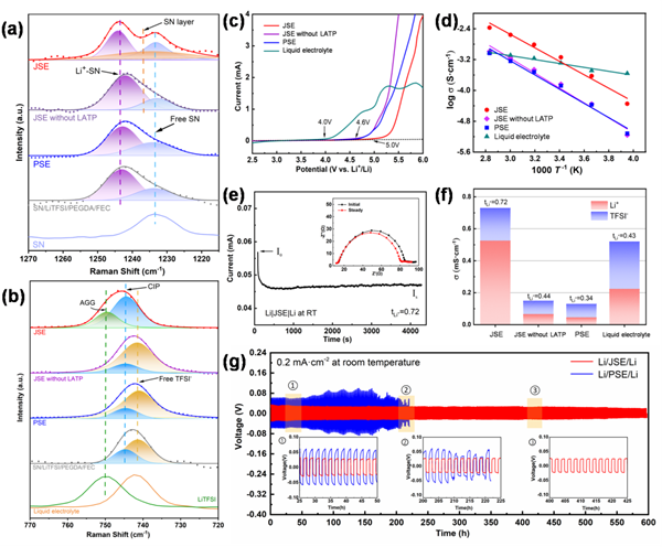 圖2a-b的拉曼光譜測(cè)試結(jié)果證明電解質(zhì)中的確存在SN吸附層,并且鋰離子溶劑化結(jié)構(gòu)被改變。固體核磁鋰譜(6Li MAS NMR)也進(jìn)一步揭示了吸附層出Li化學(xué)環(huán)境的改變。基于該結(jié)構(gòu)的電解質(zhì)在室溫條件下展示出優(yōu)異性能(圖2c-f):如較高的離子電導(dǎo)率(0.73 mS cm-1)、較高的鋰離子遷移數(shù)(0.72)、較寬的電化學(xué)窗口(5V)。以JSE組裝的鋰對(duì)稱電池可在600小時(shí)內(nèi)提供出色的循環(huán)穩(wěn)定性(圖2g)。