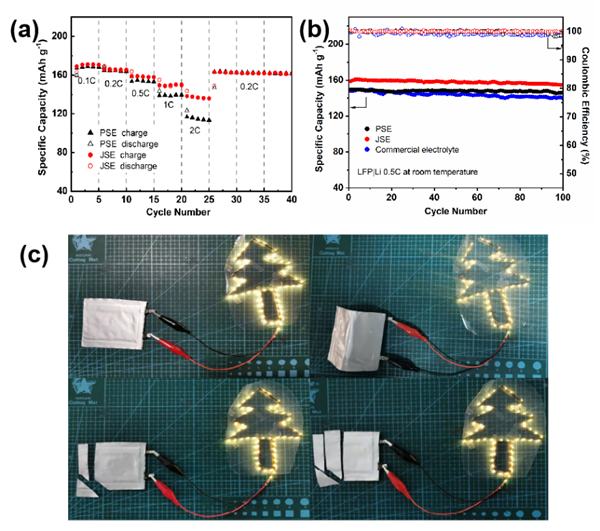 基于該JSE電解質(zhì)的固態(tài)金屬鋰電池在常溫下也表現(xiàn)出優(yōu)異的電化學(xué)性能。如圖3所示,JSE固態(tài)電池在2C的高倍率下具有高達(dá)136 mAh g-1的放電比容量;在0.5C的循環(huán)穩(wěn)定性測(cè)試中可實(shí)現(xiàn)160 mAh g-1的放電比容量,且庫(kù)倫效率可達(dá)99.9%,100圈循環(huán)后容量保持率可達(dá)96.8%。此外,JSE在軟包電池中也同樣表現(xiàn)出優(yōu)異的性能(0.5C下比容量約140 mAh g-1),并能經(jīng)受彎曲和切割等破壞性測(cè)試,表明其在未來(lái)使用中具有優(yōu)越的安全性。