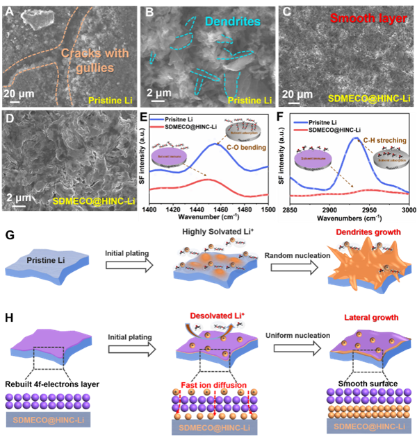 通過(guò)SEM觀察到循環(huán)后裸鋰電極表面出現(xiàn)了明顯的裂紋、溝壑和Li枝晶(圖4)。SDMECO@HINC改性后金屬鋰表面均勻光滑且沒(méi)出現(xiàn)明顯的體積變化。利用界面敏感的原位和頻率光譜(SFG)進(jìn)一步驗(yàn)證了SDMECO@HINC修飾層的催化去溶劑化作用,有效地促進(jìn)了從溶劑化的Li+中生成自由的Li+,實(shí)現(xiàn)均勻鋰沉積。