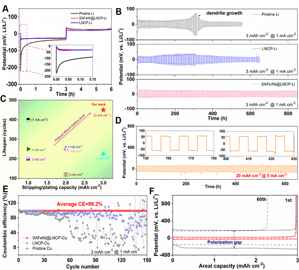 SACs調(diào)控層修飾的鋰負極在大面積容量下在1mA cm-2的鋰成核勢壘顯著下降,并在超穩(wěn)定的過電位下實現(xiàn)了850 h的循環(huán)壽命。將容量提高到20mA h cm-2, SAFeNi@LNCP-Li電極在5 mA cm-2高電流密度下仍保持~50 mV的低過電位,壽命長達為650h,展現(xiàn)出目前最強及最穩(wěn)定的剝離/鍍鋰能力。同時,在鋰銅電池中,庫倫效率也顯著提升至99.3%。低過電位和高庫倫效率歸功于SACs對鍍鋰原子動力學具有較好的加速效果(圖2)。