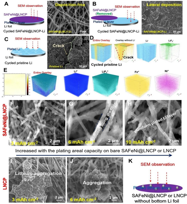 鋰原子的橫向沉積調(diào)控過程被在無底部鋰箔的裸SAFeNi@LNCP襯底上進行鍍鋰,觀察鍍鋰后的形貌所證實(圖3F-K),鋰原子優(yōu)先沉積在納米纖維表面形成一層薄層,即使在高面容量下(10mA h cm-2),大量的鋰原子仍沿著納米纖維表面均勻沉積,沒有任何垂直分支生長。而沒有原子金屬催化劑的裸LNCP膜上的鍍鋰形貌出現(xiàn)嚴重的鋰聚集,這有力地證明了SACs在促進表面鋰原子橫向擴散及均勻沉積方面的關鍵作用。