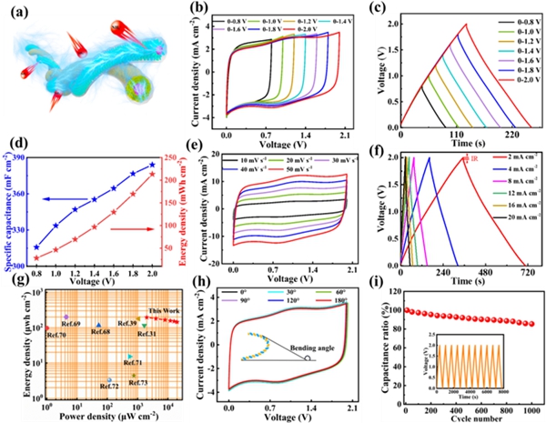 最后,組裝基于MoS2@TiN/CNTF的準(zhǔn)固態(tài)纖維狀銨根離子非對稱超級電容器(FAASC),表現(xiàn)出良好的機械柔性、電化學(xué)可逆性和典型的贗電容特性。在2 mA cm-2電流密度條件下,其比電容和能量密度分別達到了351.2 mF cm-2,195.1 μWh cm-2和2.0 V高的電勢窗口。