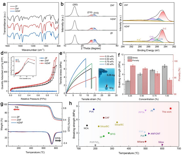 圖2. a) ZF、ZAF和HZAF的紅外光譜。b) ZF、ZAF和HZAF的XRD譜圖。c) XPS譜圖。d) ZF、ZAF和HZAF的氮氣吸脫曲線。e)不同濃度制備的HZAFs的應(yīng)力-應(yīng)變曲線。f)不同濃度制備的HZAFs的斷裂強(qiáng)度和孔隙率。g)氮?dú)鈿夥障?/font>ZF、ZNF和HZAF的TGA和DTG曲線。h)所選氣凝膠纖維耐溫值與斷裂強(qiáng)度的比較