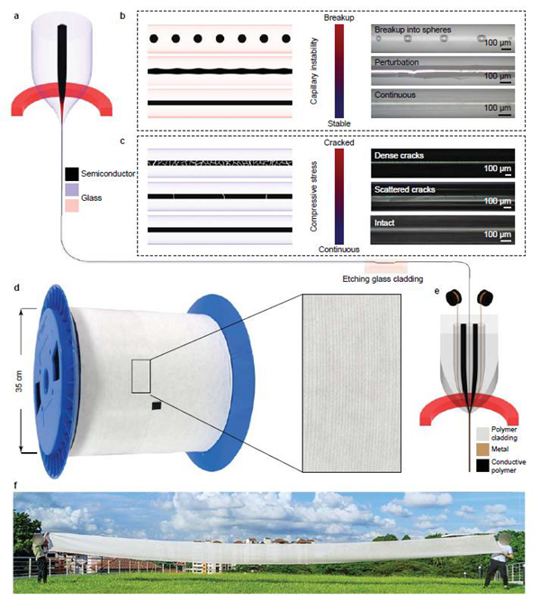 纖維技術(shù)的最新突破將具有緊密界面的功能材料在一維限域空間內(nèi)實現(xiàn)精準(zhǔn)組裝。由于半導(dǎo)體是控制器件性能的關(guān)鍵組件,因此纖維內(nèi)部半導(dǎo)體的選擇、控制和工程化是實現(xiàn)高性能功能纖維的關(guān)鍵途徑。由于加工溫度低和流體行為可控,玻璃狀半導(dǎo)體通常用于熱拉光纖。然而,與電子領(lǐng)域最廣泛使用的晶體半導(dǎo)體(例如硅和鍺)相比,它們不可避免的高密度電子缺陷導(dǎo)致所制造的纖維的電性能較差。因此,晶體半導(dǎo)體的使用更有利于從根本上推動功能纖維的進一步發(fā)展。