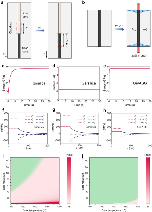 為了獲得連續(xù)超長晶體半導(dǎo)體纖維,研究者開發(fā)了各種晶體生長技術(shù),例如直拉法、布里奇曼-斯托克巴格法、浮區(qū)法和微下拉法。盡管如此,生長速度和制造長度通常僅限于每小時幾厘米和幾十厘米。熔芯光纖熱拉法通過物理熔融再拉伸物理尺寸減小的工藝成為一種柔性功能纖維的大規(guī)模制備通用技術(shù)。使用這種方法,半導(dǎo)體芯被熔化成流體流,該流體流被玻璃包層限制并熱拉成光纖。 因此,可以在一次拉絲過程中以每分鐘幾十米的速度生產(chǎn)超過數(shù)百米的半導(dǎo)體纖維。 玻璃包層和半導(dǎo)體纖芯之間的界面對纖芯中復(fù)雜應(yīng)力的發(fā)展有很大影響,導(dǎo)致纖維受到擾動或斷裂,這嚴重制約了功能纖維的大規(guī)模生產(chǎn)。盡管光纖熱拉法得到了不斷地改善,但缺乏對纖維形成的每個階段進行徹底的機械研究,無法建立合理的機械設(shè)計來實現(xiàn)超長、連續(xù)、無擾動和無斷裂的半導(dǎo)體纖維。