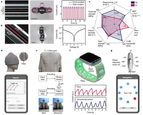 纖芯材料中的應(yīng)力主要是由纖芯和包層之間的體積變化差異引起的,這種差異源自纖芯凝固和不匹配的熱膨脹。纖芯凝固前的擾動是由毛細管不穩(wěn)定性引起的。這些機制得到建模和有限元模擬的進一步支持,通過材料選擇和工藝優(yōu)化進行合理的力學(xué)設(shè)計可以緩解和抑制此類應(yīng)力和不穩(wěn)定性。熔芯法的力學(xué)設(shè)計為高質(zhì)量半導(dǎo)體纖維的發(fā)展提供了新的研究方向,并有望擴展到更廣泛的材料范圍。使用半導(dǎo)體纖維來實現(xiàn)光電纖維、織物和功能性服裝,為實現(xiàn)高性能功能性纖維和織物提供了一條有前途的途徑。因為半導(dǎo)體是主要控制設(shè)備性能的關(guān)鍵組件,這一重大突破可能會使功能纖維朝著高性能可穿戴傳感、驅(qū)動、能量轉(zhuǎn)換和計算能力邁進一步, 從而提供具有經(jīng)濟和社會效益的創(chuàng)新。