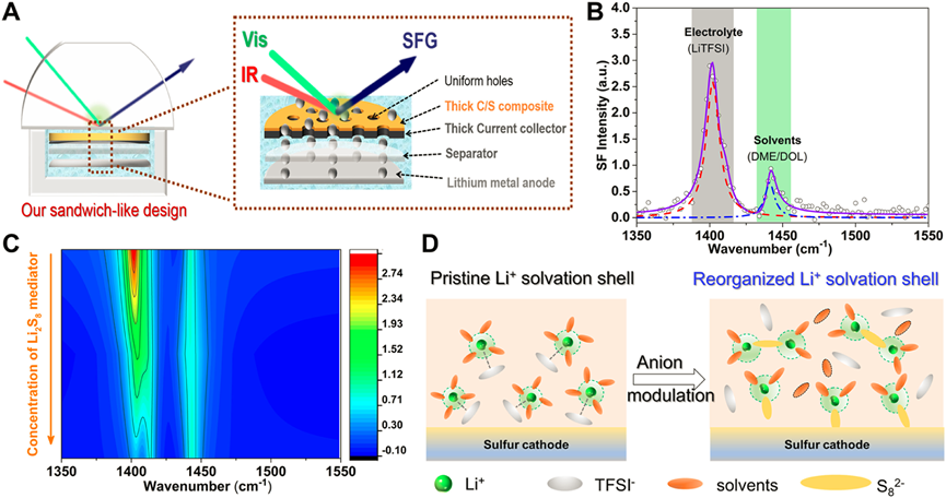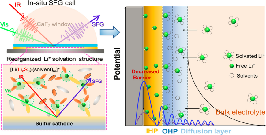圖1. 和頻光譜(SFG)測(cè)試多硫化鋰添加劑作用機(jī)理圖以及對(duì)界面內(nèi)亥姆霍茲層演變