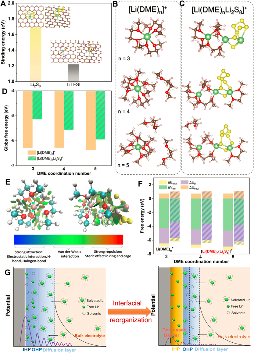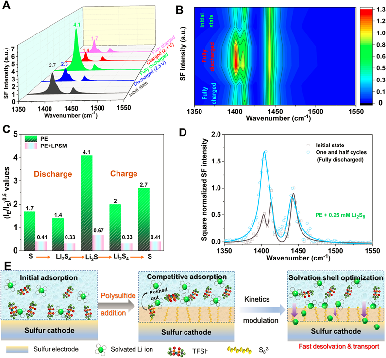 圖3. 充放電過程中Li+溶劑化層的動(dòng)態(tài)變化和多硫化鋰添加劑的機(jī)理示意圖