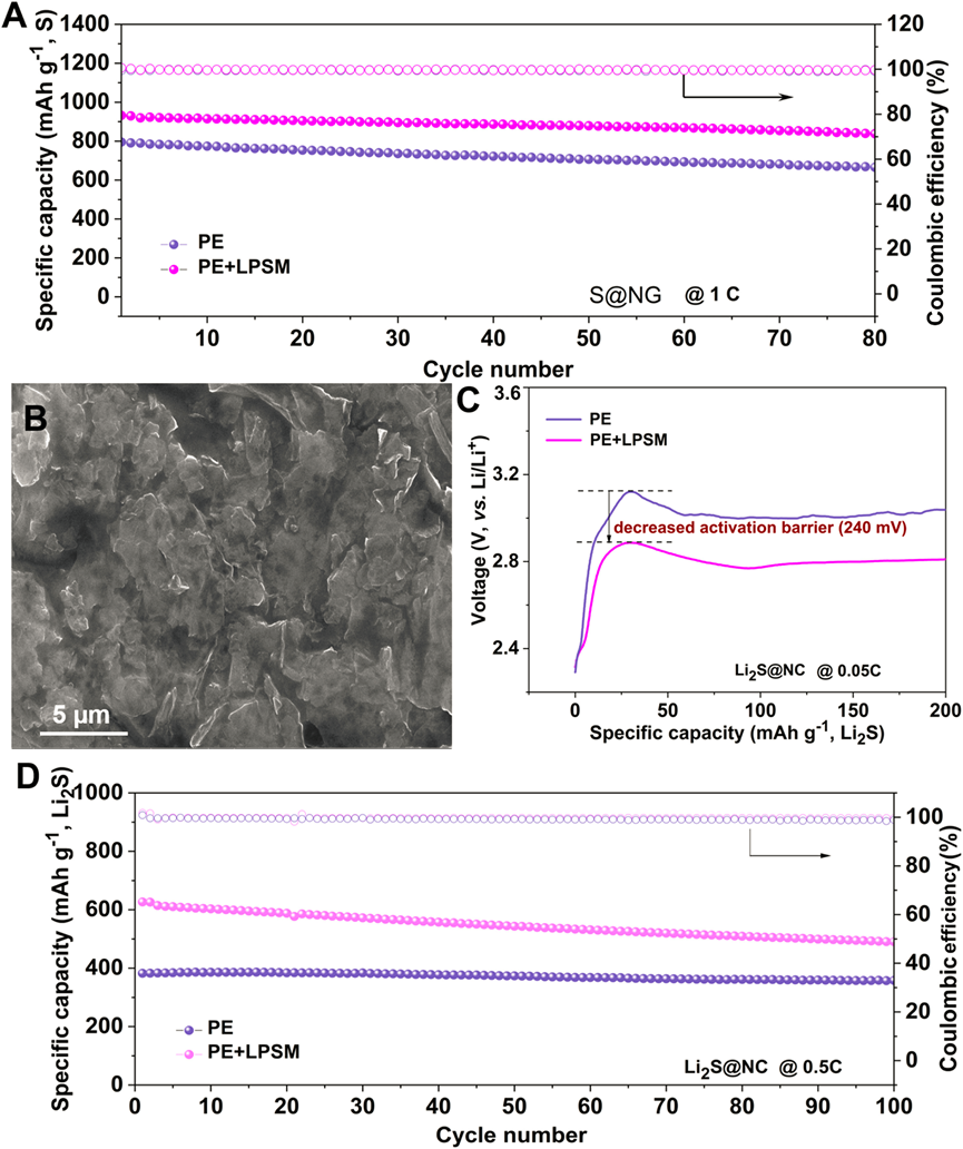 研究團(tuán)隊(duì)對(duì)Li-S電池的電化學(xué)性能進(jìn)行了比較,具有最佳溶劑化殼的電池比沒有Li2S8的電池表現(xiàn)出更高的初始容量和循環(huán)穩(wěn)定性。對(duì)循環(huán)后的正極進(jìn)行掃描電子顯微鏡 (SEM)圖像,表現(xiàn)出光滑的表面和硫的均勻分布,在完全充電/放電狀態(tài)下沒有任何硫或 Li2S聚集,這驗(yàn)證了多硫化物可以調(diào)節(jié)界面Li+傳輸和加速溶劑化殼重組。通過重組的溶劑化殼,Li2S的脫鋰勢(shì)壘可以從3.12 V顯著降低至2.88 V,多硫化物改變了溶劑化殼結(jié)構(gòu),緩沖了Li+從Li2S到電解質(zhì)的劇烈化學(xué)環(huán)境的變化,并減少了由吸附引起的額外界面能壘。