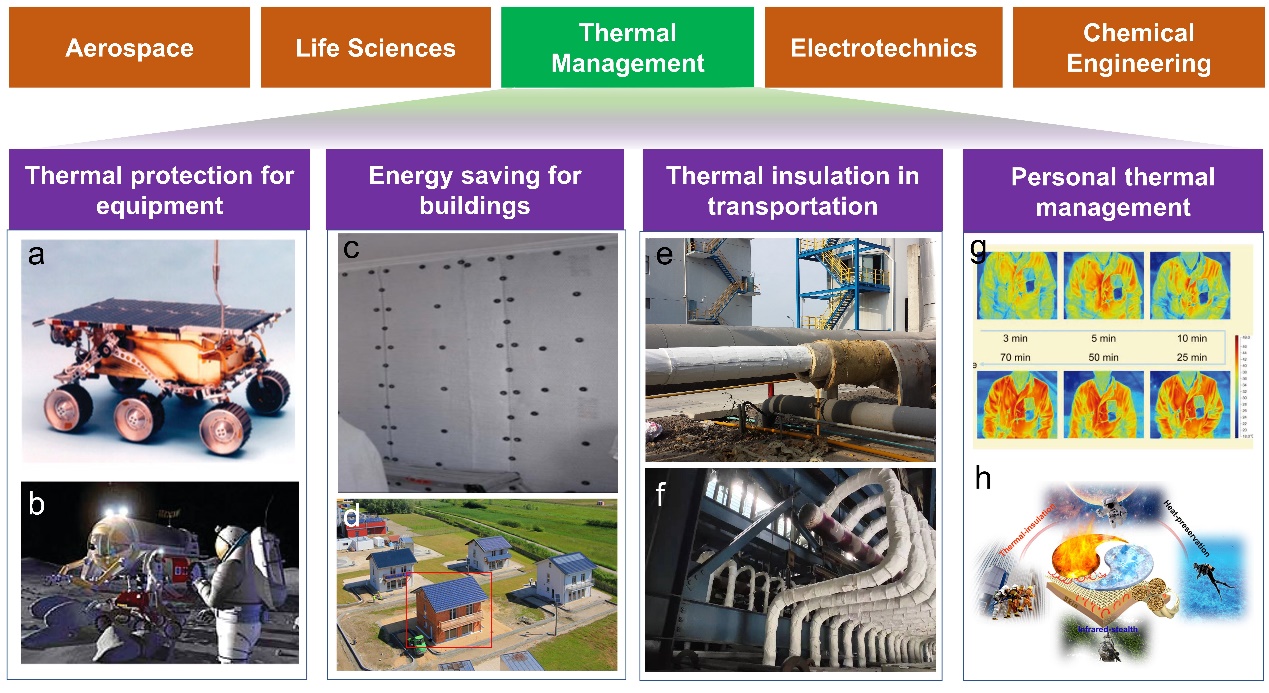 圖1. 氣凝膠在熱管理方面的具體應(yīng)用:(a)和(b)極端條件下的設(shè)備熱防護(hù);(c)和(d)二氧化硅氣凝膠在建筑中的節(jié)能減排應(yīng)用;(e)和(f)氣凝膠在管道中的隔熱保溫應(yīng)用;(g)用于個(gè)人被動降溫的氣凝膠復(fù)合薄膜;(h)氣凝膠用于雙模人體熱管理。