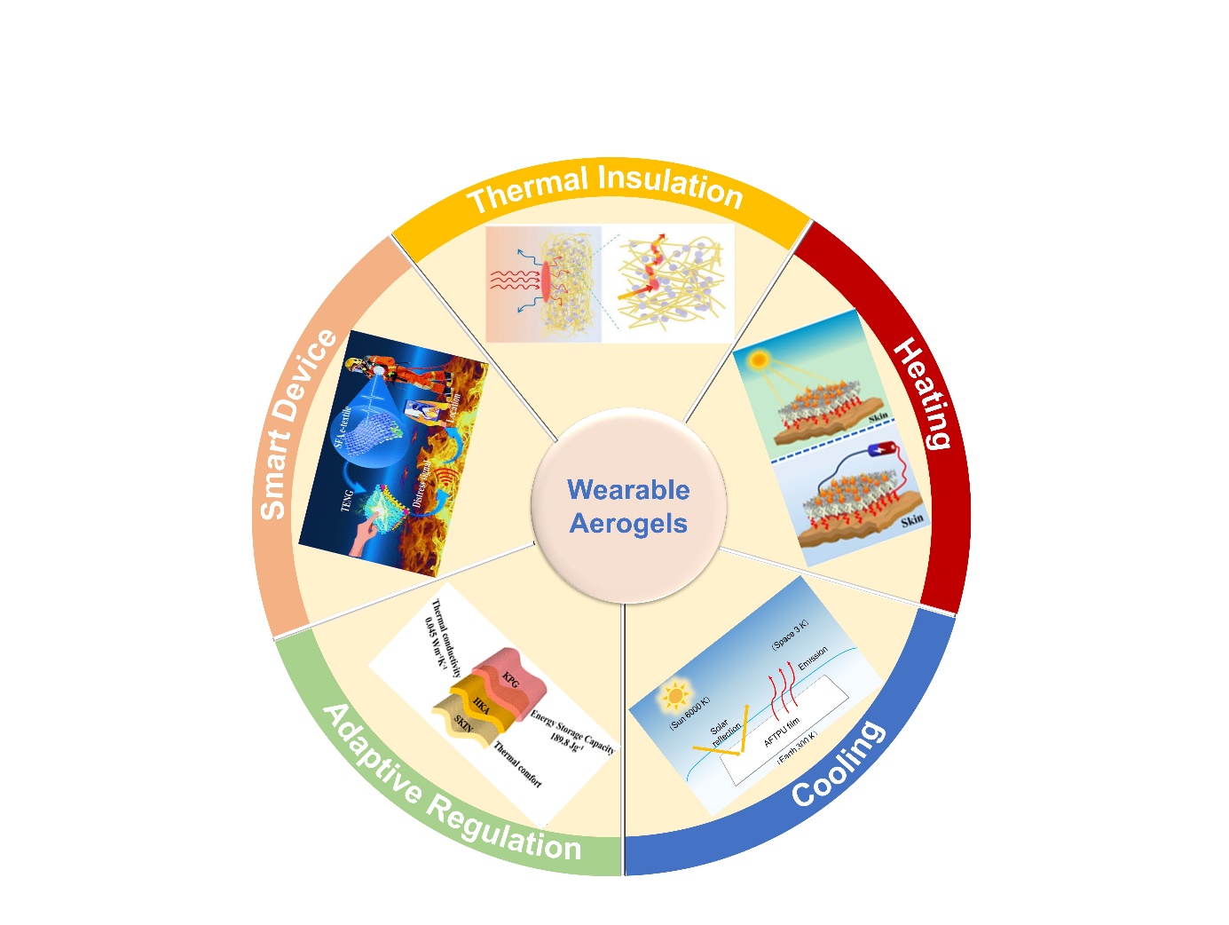 近年來,中國科學(xué)院蘇州納米技術(shù)與納米仿生研究所王錦研究員與合作者發(fā)現(xiàn)并報(bào)道了系列有別于氣凝膠“隔熱保溫”的“另類”熱管理行為,如主被動加熱(ACS Appl Mater Interfaces2022,14,46569;ACS Appl Eng Mater2023,1,2269;ACS Nano2015,9,4244)、被動輻射致冷(Adv Funct Mater2023,33,2300441;Adv Sci 2022,9,2201190;J Mater Chem A2023,11,15227)、自適應(yīng)溫度調(diào)控(ACS Nano2021,15,19771;ACS Nano2015,9,11389;Chem Eng J2023,470,144258;Macromol Rapid Commun2023,44,2200948)、溫度開關(guān)(Device2023,1,100095;Adv Mater2023,35,2207638)、可穿戴器件(Adv Mater2024,36,2310023;Adv Funct Mater 2024,34,2314947;)、耐1300℃高溫涂料(Adv Funct Mater2023,33,2309148)等。可見氣凝膠具有豐富的熱管理行為,為可穿戴人體熱管理應(yīng)用提供了各種選項(xiàng)。最近,為了回答上述問題,王錦等人結(jié)合團(tuán)隊(duì)研究成果,通過追本溯源,查閱大量歷史文獻(xiàn)和最新的研究成果,在ACS Nano上發(fā)表了題為Wearable Aerogels for Personal Thermal Management and Smart Devices的綜述文章,系統(tǒng)性地梳理了氣凝膠隔熱保溫的發(fā)展歷史、可穿戴氣凝膠的發(fā)展現(xiàn)狀以及面臨的瓶頸問題等。
