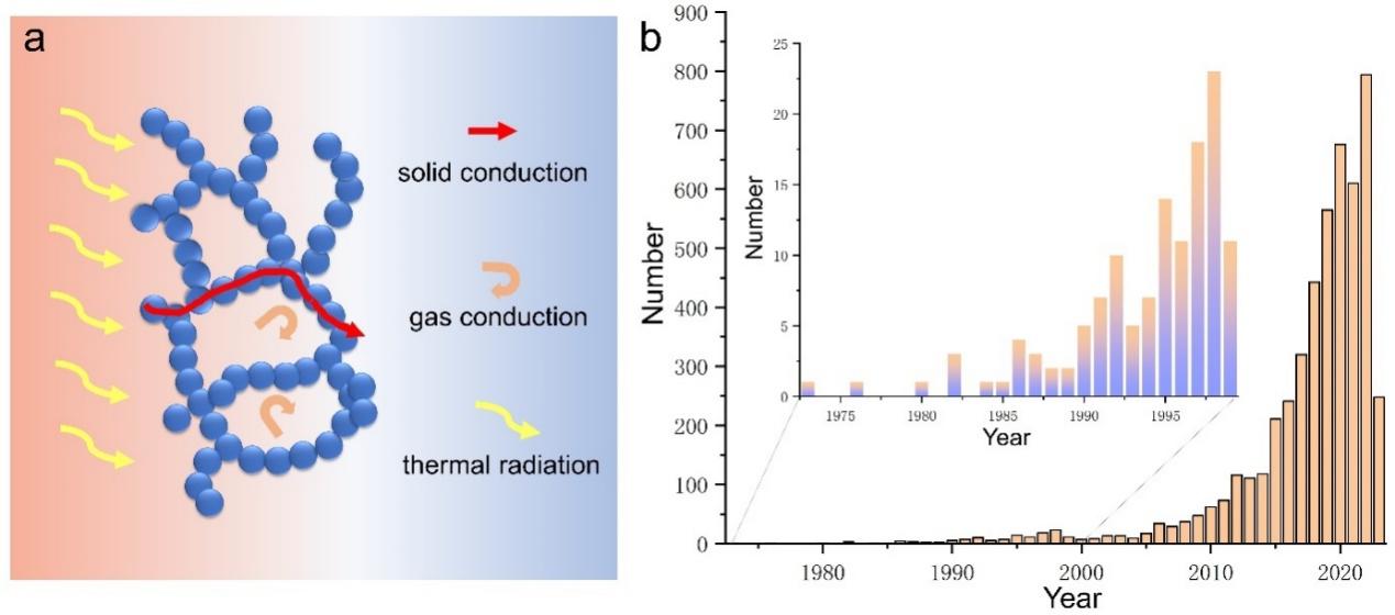 圖3. 氣凝膠熱傳導(dǎo)示意圖以及氣凝膠在熱管理應(yīng)用中的歷年文獻(xiàn)數(shù)量