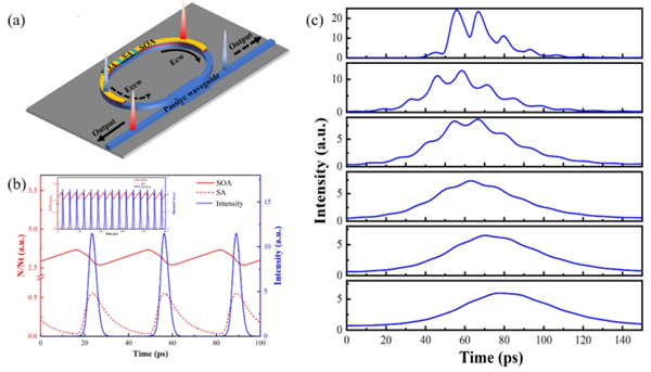 基于此,中國科學(xué)院蘇州納米技術(shù)與納米仿生研究所半導(dǎo)體顯示材料與芯片重點(diǎn)實(shí)驗(yàn)室的III-V信息光電子器件研究團(tuán)隊(duì)首次基于時(shí)域行波方程、載流子密度偏微分方程建立了PML-SRLs的理論模型,系統(tǒng)研究了該類器件的調(diào)控規(guī)律與設(shè)計(jì)優(yōu)化準(zhǔn)則。研究揭示出:PML-SRLs的工作狀態(tài)取決于激光器中的增益-損耗的時(shí)域平衡,該平衡由PML-SRLs中的半導(dǎo)體光放大器(SOA)的載流子積累速率、可飽和吸收體(SA)的載流子壽命、環(huán)形諧振腔的往返時(shí)間三者之間的瞬態(tài)關(guān)系決定。此外,該工作首次發(fā)現(xiàn)使用具有窄增益譜的SOA與短諧振腔長的鎖模激光器可導(dǎo)致輸出脈沖合并,獲得高能量光脈沖。該項(xiàng)工作解決了PML-SRLs系統(tǒng)理論缺乏問題,所揭示的物理機(jī)制與優(yōu)化準(zhǔn)則適用于所有類型的PML-SRLs器件,為其進(jìn)一步發(fā)展和應(yīng)用奠定了基礎(chǔ)。