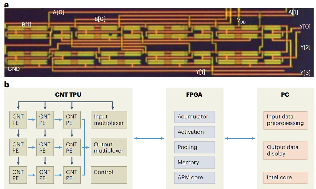 圖1. 由3000個(gè)碳納米管晶體管構(gòu)筑的碳納米管張量處理單元(TPU)