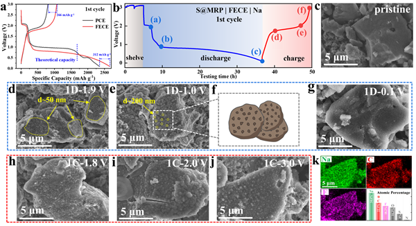 圖2.?S@MRP||Na電池在首次充/放電過程中S陰極的電化學(xué)行為與形貌演變