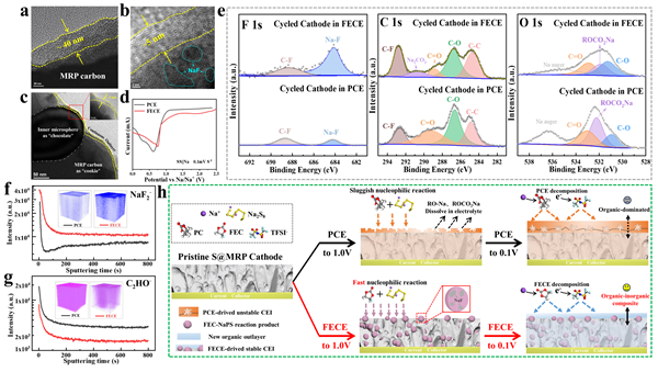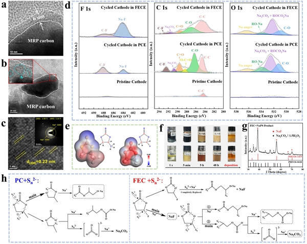 圖4. 在首次繼續(xù)放電至0.1 V時(shí),不同電解液中S@MRP||Na電池陰極形成的CEI的微觀結(jié)構(gòu)和組成