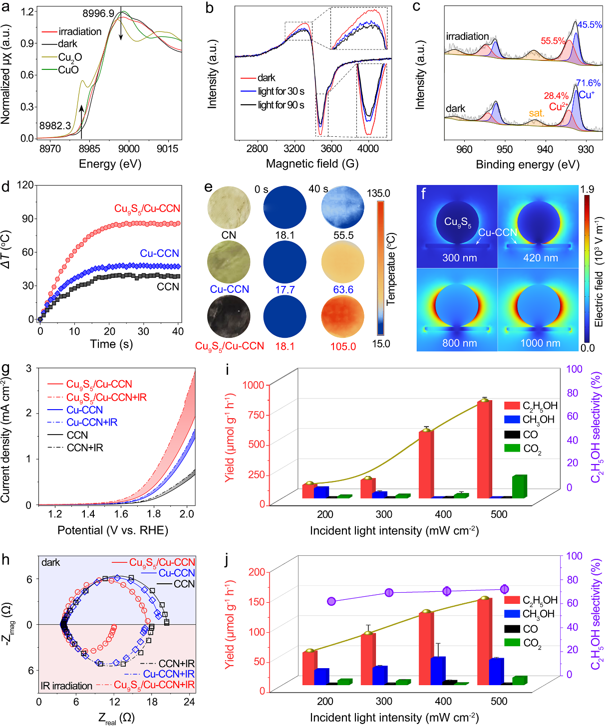 圖4. Cu9S5/Cu-CCN光還原和光氧化位點(diǎn)的探究、光熱效應(yīng)的探究及不同光強(qiáng)下光驅(qū)動(dòng)甲烷轉(zhuǎn)化為乙醇的活性和選擇性
