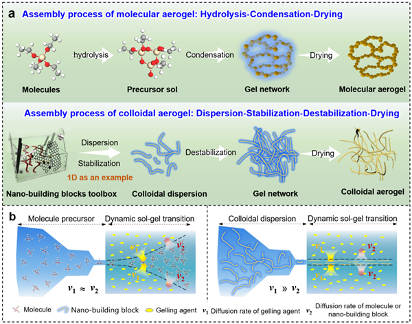 圖1. (a)分子氣凝膠與膠體氣凝膠的組裝策略。(b) 傳統(tǒng)濕法成型工藝中分子氣凝膠和膠體氣凝膠的動(dòng)態(tài)溶膠-凝膠轉(zhuǎn)變示意圖