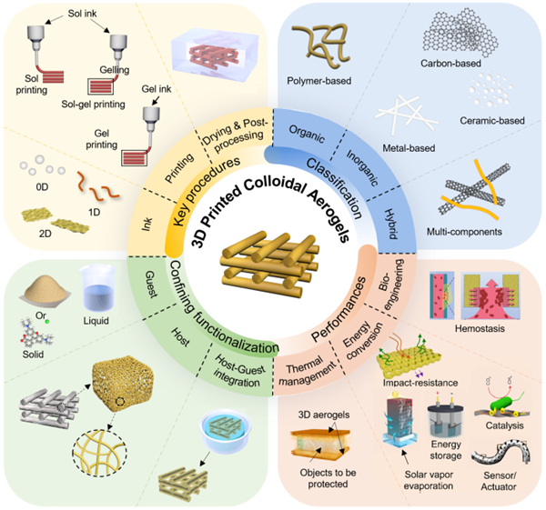 圖2. 3D打印膠體氣凝膠的關(guān)鍵工序、種類、限域功能化及應(yīng)用
