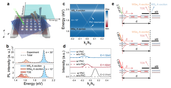 圖1. 懸空的原子層級WS?/WSe?轉(zhuǎn)角異質(zhì)光子晶體中的激子發(fā)光在能量-動量空間的分選
