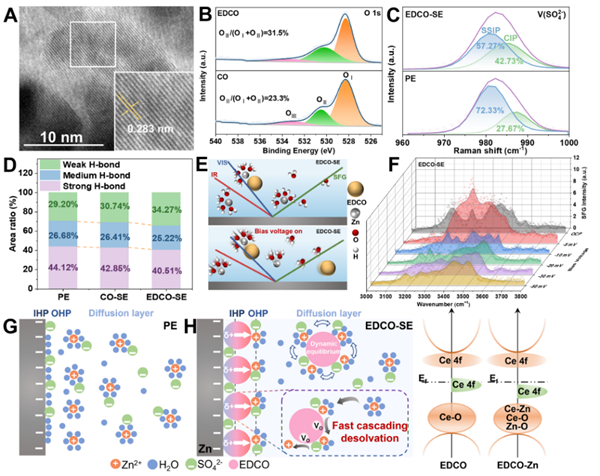 通過一系列實驗證明了懸浮電解液在實際應(yīng)用中的穩(wěn)定性,并通過XPS,莫特-肖特基曲線等證明了CO與EDCO之間氧缺陷的差異,驗證了氧缺陷活性位點策略的有效性。拉曼光譜驗證了懸浮電解液對溶劑化結(jié)構(gòu)和電解液氫鍵組成的改變。原位界面和頻光譜(SFG)監(jiān)測了有/無偏置電壓下界面Zn[(H2O)6]2+的演化過程,揭示了EDCO懸浮電解液能顯著促進去溶劑化過程,加快去溶劑化動力學(xué)。EDCO納米顆粒在加速Zn2+去溶劑化時調(diào)節(jié)電解質(zhì)中的氫鍵網(wǎng)絡(luò)和溶劑化結(jié)構(gòu),為抑制枝晶生長和提升電化學(xué)性能提供幫助。(圖2)