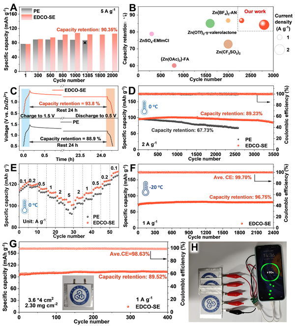 懸浮電解液也顯著提升了Zn||PANI全電池的電化學(xué)性能。使用EDCO懸浮電解液的Zn||PANI全電池具有優(yōu)異的低溫循環(huán)穩(wěn)定性、倍率性能和低自放電率,組裝的大尺寸軟包在1 A g-1下循環(huán)400次后有89.52%的高容量保持率,并且成功為手機充電,賦予了懸浮電解液巨大的應(yīng)用潛力。