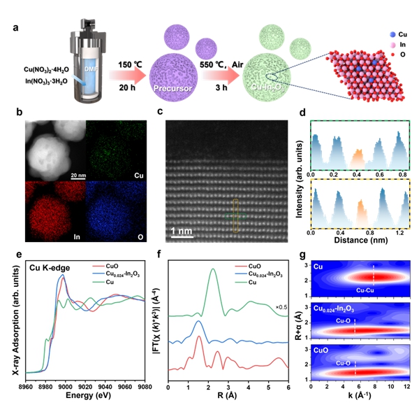 近日,中國科學院蘇州納米所李逸凡高級工程師與中國科學技術大學蘇州高等研究院熊宇杰教授、劉東教授合作在國際知名期刊Angwandte Chemie International Edition上發(fā)表題為Tailoring Oxygen Vacancies with Atomically Dispersed Cu Sites for Stable and Efficient Photothermal CO2?Conversion的研究性論文。該研究成功開發(fā)了一種具有原子級分散銅單原子的Cu-In2O3催化劑,在光熱CO2轉化中展現(xiàn)出卓越性能。銅單原子的引入誘導產生氧空位,顯著增強CO2吸附活化、光捕獲能力與光熱效應,同時促進H2解離。當銅負載量為2.4 wt%時,催化劑實現(xiàn)最優(yōu)單原子分散與最高氧空位濃度,在光熱逆水煤氣變換(RWGS)反應中表現(xiàn)出超越同類樣品的催化活性(CO選擇性>99%)、長效穩(wěn)定性(>450小時)與光熱能量轉化效率(46.17 mol·gCu-1·h-1)。相較于傳統(tǒng)熱催化,該體系在降低200 °C反應溫度條件下仍保持優(yōu)異性能。借助蘇州納米所納米真空互聯(lián)實驗站的原位(準原位)表征技術,該研究結果深化了對單原子催化劑與氧空位協(xié)同機制的理解,為高性能光熱催化劑設計提供了理論指導。該銅單原子修飾的In2O3催化劑作為新型光熱催化平臺,通過光能利用與局域熱管理優(yōu)化,為化學能高效轉化開辟了可持續(xù)路徑,為清潔能源技術發(fā)展提供了新思路。