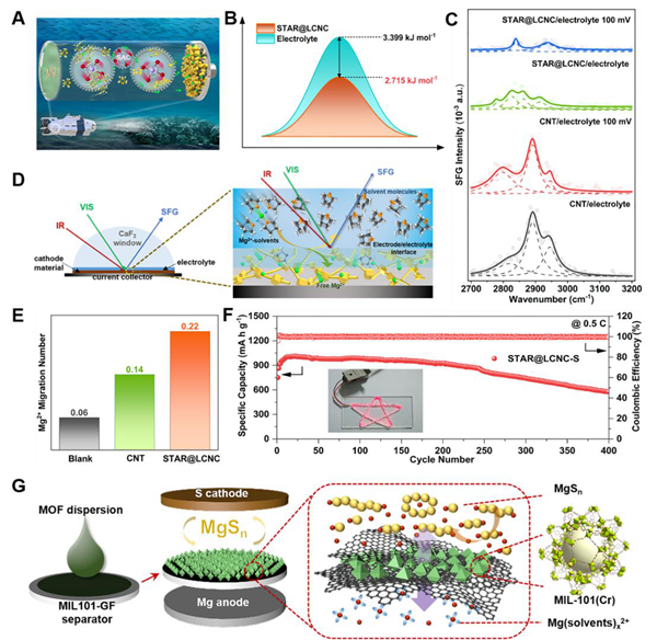 在實(shí)際電池環(huán)境中,在到達(dá)硫正極之前,Mg2+傾向于與電解質(zhì)中的溶劑分子合作以形成Mg(solvents)x2+。在硫/電解質(zhì)界面處,大尺寸的Mg(solvents)x2+團(tuán)簇首先解離形成Mg2+,這是多硫化物氧化還原轉(zhuǎn)化反應(yīng)的前提。因此,Mg2+在界面或正極內(nèi)部的去溶劑化和擴(kuò)散行為與Mg(solvents)x2+溶劑化結(jié)構(gòu)的狀態(tài)密切相關(guān)。將配位溶劑分子從Mg(solvents)x2+溶劑化鞘中解離出來(lái)對(duì)于形成自由分離的Mg2+顯得非常重要。一般來(lái)說(shuō),從Mg(solvents)x2+中直接分離溶劑分子涉及相關(guān)化學(xué)配位鍵的斷裂,從而呈現(xiàn)高能量勢(shì)壘。因此,有必要降低用于形成Mg2+的界面屏障以平滑地?cái)U(kuò)散穿過(guò)正極/電解質(zhì)界面。