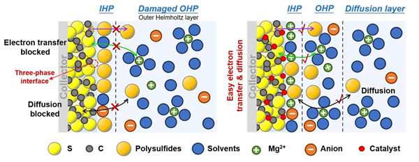 Mg-S化學(xué)反應(yīng)是發(fā)生在導(dǎo)電基質(zhì)和電解質(zhì)之間的界面處的大多數(shù)界面反應(yīng)。為了提高硫的利用率,應(yīng)擴(kuò)大導(dǎo)電碳基體/電解質(zhì)/硫三相界面的重疊區(qū)域,并在三相界面引入合適的催化位,以促進(jìn)Mg2+與S的結(jié)合,促進(jìn)后續(xù)的硫/硫化物轉(zhuǎn)化。同時(shí)需要注意的是,應(yīng)設(shè)計(jì)合適的碳結(jié)構(gòu)或催化位點(diǎn),限制多硫化物的擴(kuò)散,防止它們穿梭到鎂負(fù)極側(cè)形成“死硫”。還需要確保催化劑充分暴露而不被硫化物覆蓋和鈍化,以有效增強(qiáng)Mg-S電池的可逆性。雙電層(EDL)由擴(kuò)散層和亥姆霍茲層組成,其中亥姆霍茲層又分為內(nèi)亥姆霍茲面(IHP)和外亥姆霍茲面(OHP)。通過(guò)添加催化中心,S正極表面的EDL組分被重構(gòu)。由于催化劑對(duì)Mg2+的去溶劑化和吸附的催化作用,Mg(solvents)x2+結(jié)構(gòu)將被吸引向正極/電解質(zhì)界面移動(dòng)。當(dāng)Mg(solvents)x2+結(jié)構(gòu)與S正極表面接觸時(shí),由于催化劑對(duì)未來(lái)轉(zhuǎn)化反應(yīng)的催化作用,Mg2+經(jīng)歷快速去溶劑化。與IHP中溶劑分子顯著增加的空白樣品相比,催化劑將大量游離Mg2+和多硫化物限制在三相界面,進(jìn)一步加速了后續(xù)的硫/硫化物轉(zhuǎn)化。