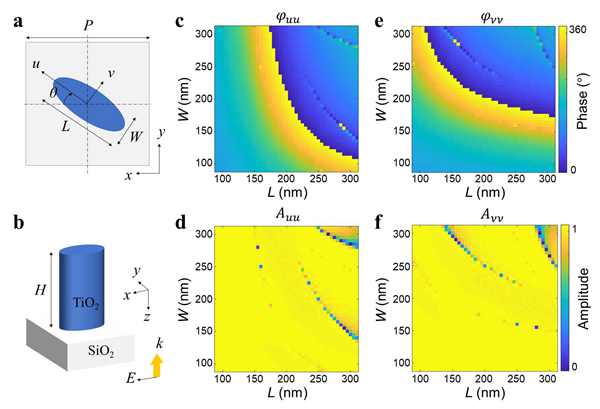 圖2. SiO2?基底上 TiO2納米柱組成的單原子超表面相位/透過率仿真結(jié)果