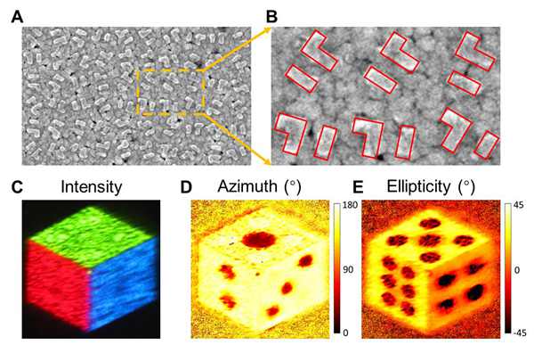 圖7. 不對稱全彩矢量全息圖測量結(jié)果。(A)制備的超表面的?SEM?圖像和(B)其局部放大圖像。(C)測量的30°方向區(qū)域的強(qiáng)度、(D)方位角和(E)橢偏率。