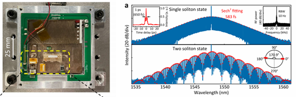 圖1左:自注入鎖定微腔光頻梳模塊實(shí)物圖。右:產(chǎn)生的光頻梳光譜