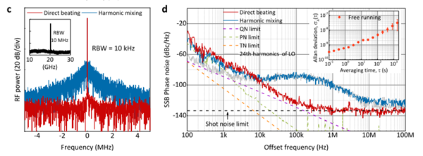 在未來毫米波太赫茲波高速通信應(yīng)用中,低相噪的源是核心器件,其噪聲決定了通信的帶寬。而傳統(tǒng)電學(xué)倍頻方法在產(chǎn)生高頻率的射頻和太赫茲信號(hào)時(shí)其相噪是隨著頻率增加而增加的。