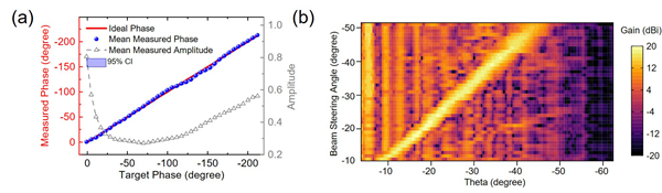 圖2. ?(a)芯片的相位調(diào)制精度測量結(jié)果,(b)遠場方向圖