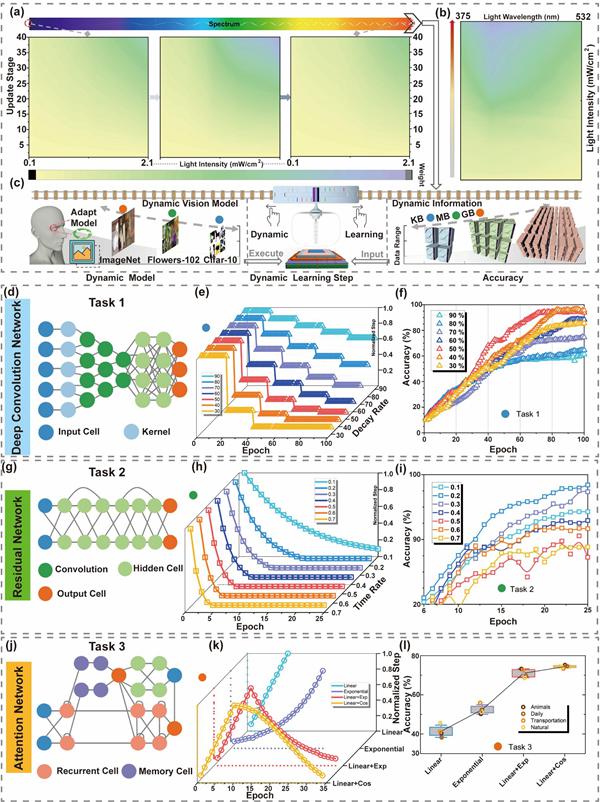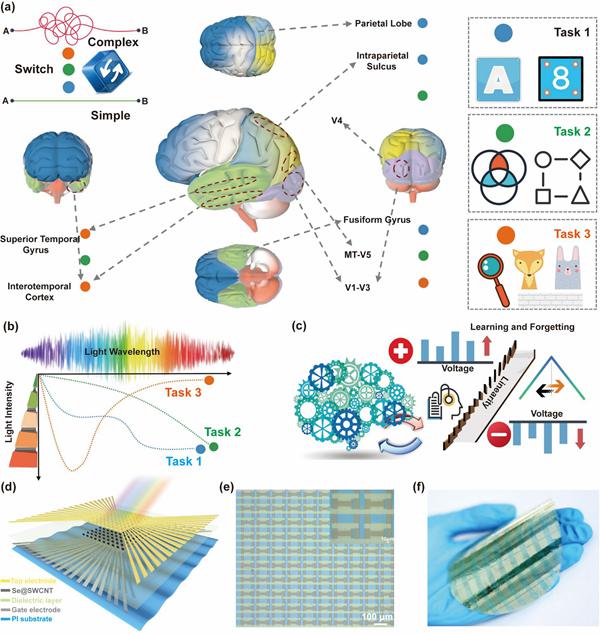 蘇州納米所康黎星團(tuán)隊(duì)提出了一種通過(guò)化學(xué)氣相輸運(yùn)制備的硒內(nèi)嵌單壁碳納米管(Se@SWCNTs)的一維范德華異質(zhì)結(jié)。利用像差校正透射電子顯微鏡 (AC-STEM) 以及光譜學(xué)和電學(xué)表征,成功證實(shí)了雙鏈硒被封裝在單壁碳納米管內(nèi)部。與先前研究不同,通過(guò)溶液沉積技術(shù)成功制備了大面積的半導(dǎo)體性 Se@SWCNTs?薄膜。利用這些薄膜,在柔性基底上構(gòu)建了4英寸晶圓級(jí)的 Se@SWCNTs 一維范德瓦爾斯異質(zhì)結(jié)光電晶體管。這種方法消除了對(duì)多層異質(zhì)結(jié)或復(fù)雜電路的需求,從而簡(jiǎn)化了陣列集成和晶圓級(jí)制造。結(jié)合有效的柵極調(diào)制,實(shí)現(xiàn)了對(duì)?PPC 和NPC 響應(yīng)的高度線性和精確控制。其線性擬合相關(guān)系數(shù) (R2) 超過(guò) 0.99。?同時(shí)實(shí)現(xiàn)了具有超過(guò)128個(gè)存儲(chǔ)態(tài)的線性?PPC?和?NPC。通過(guò)利用器件在不同光強(qiáng)度(0.1–2.1 mW/c㎡)和波長(zhǎng)范圍下的性能變化,我們展示了在受腦區(qū)功能啟發(fā)的、復(fù)雜度遞增的三項(xiàng)任務(wù)中,權(quán)重規(guī)則處理的高度一致性。重要的是,這三項(xiàng)不同視覺(jué)任務(wù)(數(shù)字/字母識(shí)別、形狀識(shí)別和特征識(shí)別)所需的神經(jīng)結(jié)構(gòu)(深度卷積網(wǎng)絡(luò)、殘差網(wǎng)絡(luò)和注意力網(wǎng)絡(luò))及其對(duì)應(yīng)的衰減率(階梯式、指數(shù)式和預(yù)熱式)也是不同的。所提出的晶體管能夠通過(guò)光學(xué)混合編程促進(jìn)受生物啟發(fā)的腦區(qū)之間的轉(zhuǎn)換,從而適應(yīng)動(dòng)態(tài)的視覺(jué)環(huán)境。這種首次引入的創(chuàng)新方法,為腦啟發(fā)計(jì)算和仿生視覺(jué)的實(shí)際應(yīng)用鋪平了道路。